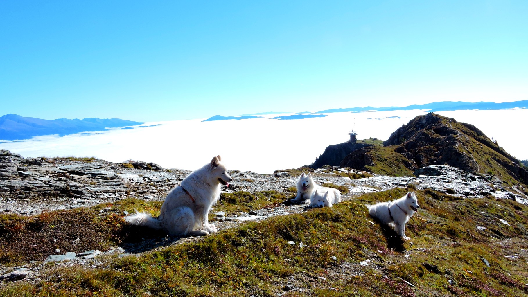 Das einsteigen in die Gondel mit vier Hunden war spannend, hatten sie ja noch nie gemacht. Beim zweiten Versuch und mithilfe des sehr sehr freundlichen Bergbahnbediensteten gelang uns das dann. Mitten auf der Fahrt war der Nebel plötzlich weg und wir hatten den erwarteten strahlenden Sonnenschein. Einfach ein Traumtag!!!!!